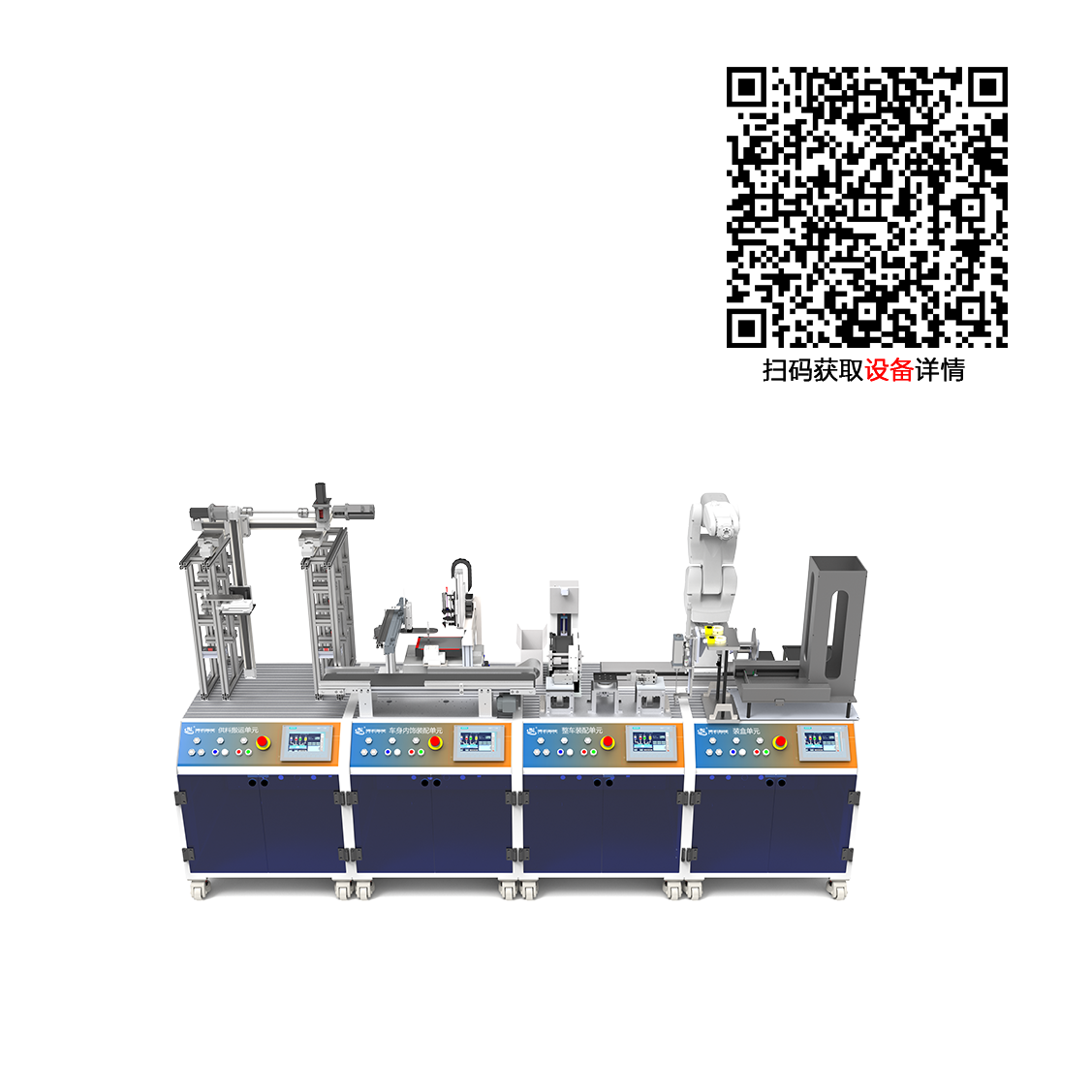 产品概述:由供料搬运单元、车身内饰装配单元、整车装配单元以及智能立体仓储单元组成,能完成物料的自动供料、皮带传输、内饰精准安装、整车装配以及成品的智能入库等完整生产工序流程;融汇应用了工业机器人、精密运动控制、智能仓储管理、数字孪生等前沿工业技术;采用高度模块化设计,支持多种组合模式。满足自动化生产线安装调试、智能产线集成调试与运行等核心课程的实训教学需求。工业机器人可选博诺、埃夫特、新松、KUKA、ABB等主流品牌。
