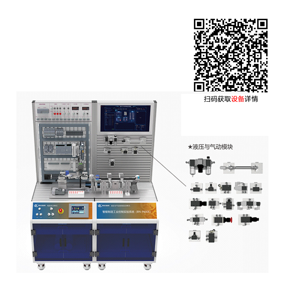 产品概述:采用开放式、模块化设计,由电气控制、液压与气动、智能制造等模块组成,融合了低压电气、热继电器、交流接触器、三相异步电机变频调速,步进驱动、伺服驱动、PLC、触摸屏、工业网络、液压与气动、系统安装调试、故障检测与诊断等技术。可满足智能制造系统在设计、集成、编程、开发等控制方面的教学任务。PLC可选配西门子、汇川等品牌;气动件可选亚德客、SMC、FESTO等品牌。