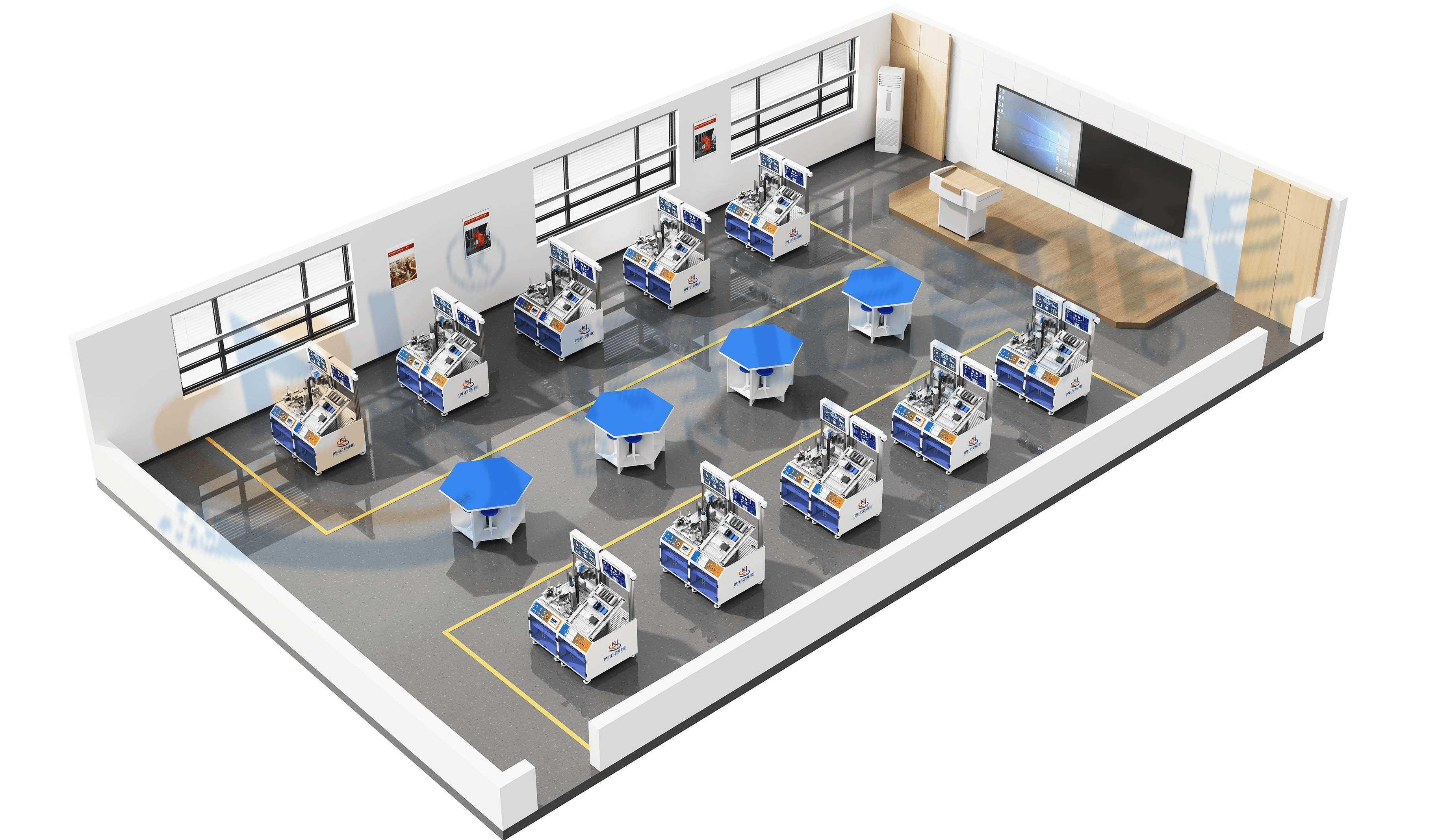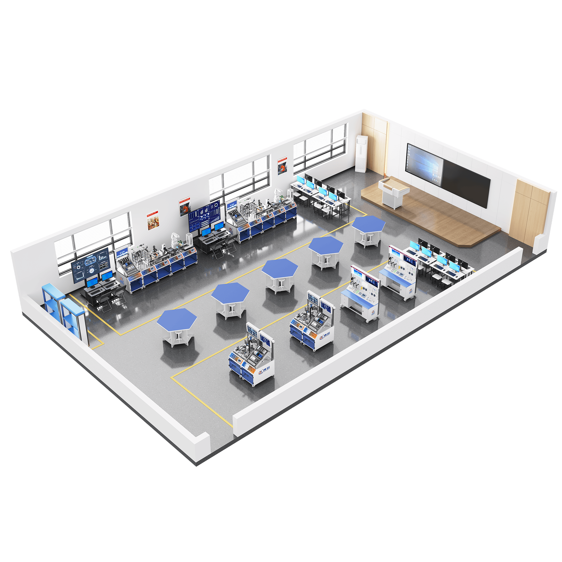 工业互联网实训基地:以“工业互联赋能实战教学,技术融合培育产业人才”为核心,深度聚焦工业互联网、数字孪生、人工智能、智能控制等前沿技术,打造覆盖物料分拣、智能仓储、电池组智能产线、全流程数字化管理等沉浸式工业实训场景。基地紧密对接“数字中国建设2025年行动方案”、“智改数转”等战略部署,将工业互联网的行业技术标准、数据交互规范、安全防护要求全面融入实训体系,让学生在贴合产业实际的互联环境中锤炼核心能力。基地覆盖工业互联网核心领域:工业互联网集成应用系统(BN-N421A/B)、制造业数字化转型创新平台(BN-N425)、博诺数智云系统(BN-DIC)、工业互联网云平台(BN-IICP)、数字孪生云平台(BN-DTCP)等系列核心产品,构建了从工业网络搭建、传感器选型调试、PLC编程、数据采集与标识解析到数字孪生建模、智能运维可视化、云端协同管理的全链条实训体系。助力学生系统掌握工业数据处理、边缘计算应用、产线虚拟调试、数字化解决方案设计等核心技能,同时培养工业互联网运维、智能制造系统管控、数字化转型落地等综合职业能力。