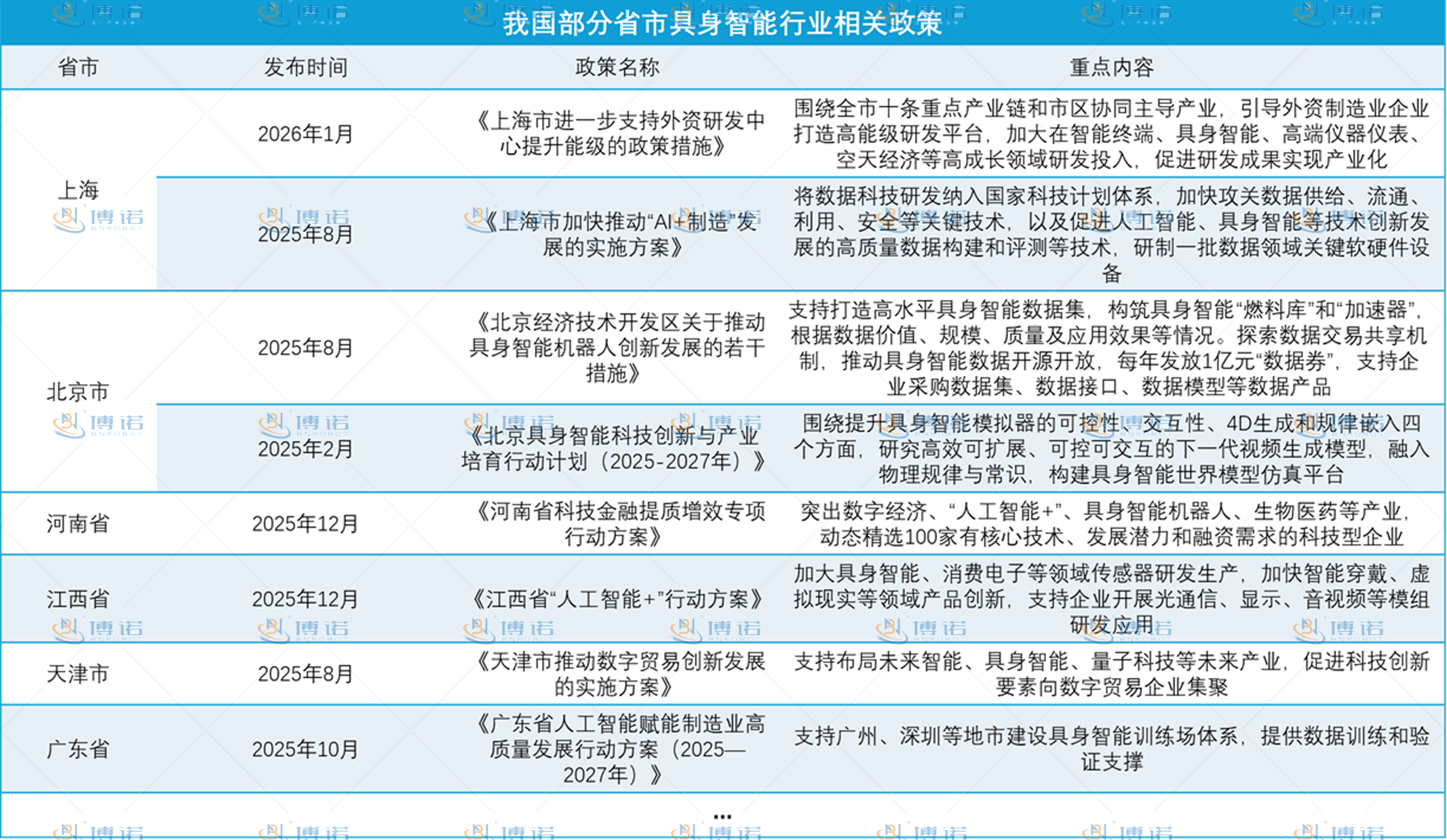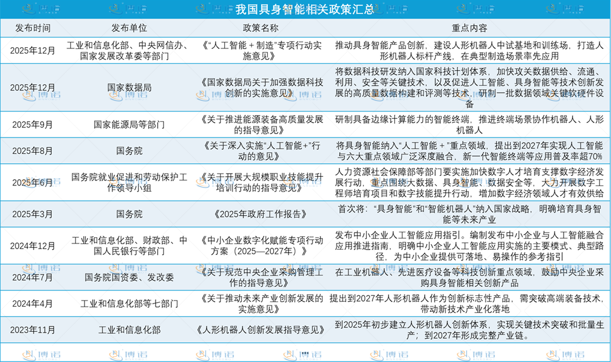具身智能作为人工智能从“虚拟算法”向“物理实体”跃迁的核心载体,是未来产业增长的核心,已被纳入国家未来产业重点培育清单。2025年全国两会《政府工作报告》首次明确提出“培育壮大具身智能等未来产业”,标志着具身智能正式进入国家战略规划,进入规模化培育与应用的关键期。《新一代人工智能发展规划》、《“人工智能+制造”专项行动实施意见》等政策密集出台,明确提出推动具身智能产品创新、打造人形机器人标杆产线、建设实训基地的要求,加速技术从实验室走向规模化商用。