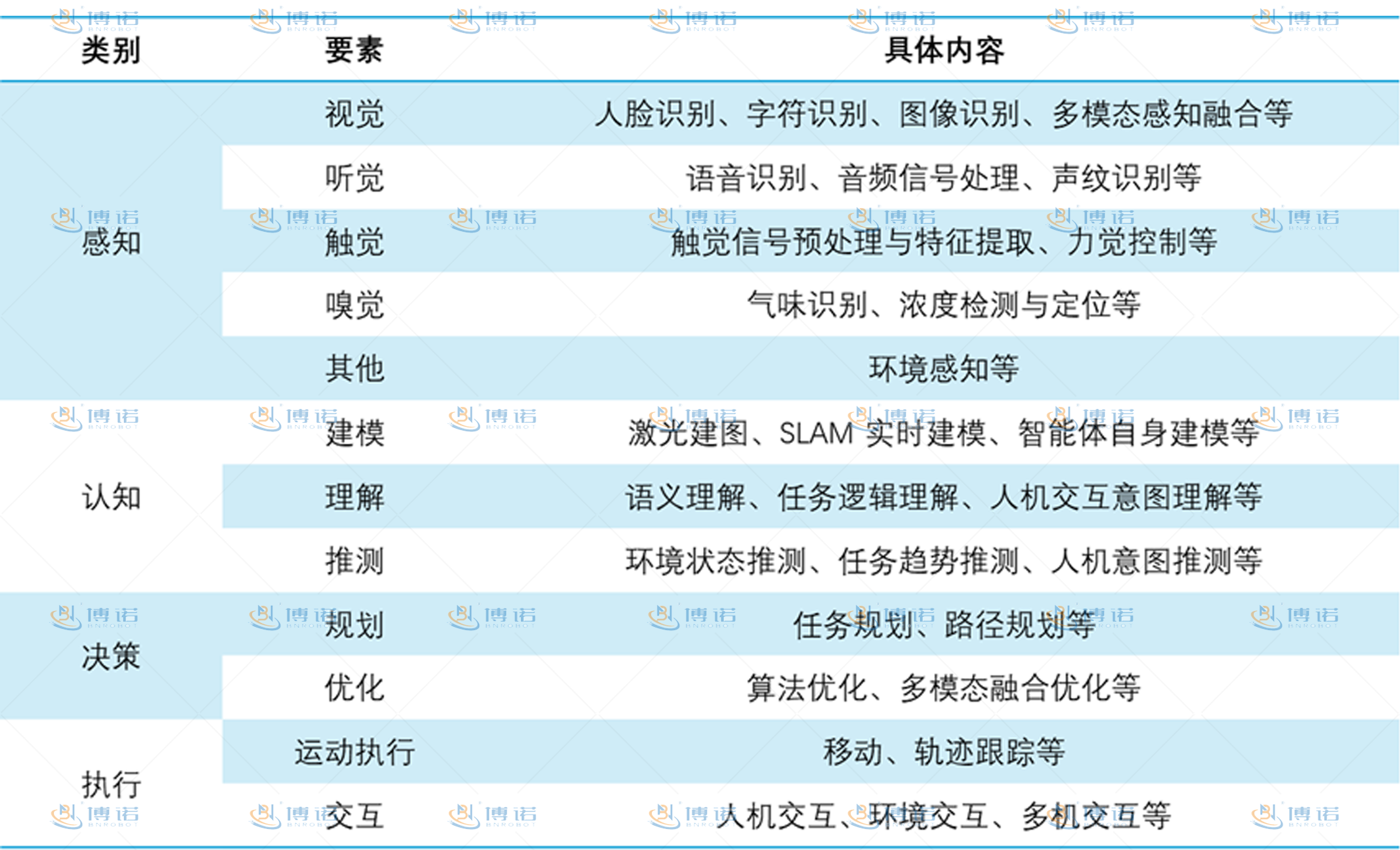 具身智能整合感知、认知、决策及执行等核心要素,各要素的协同联动可支撑机器人实现环境感知、人机协同交互与任务自主完成,是落地具身智能技术的核心基础支撑。