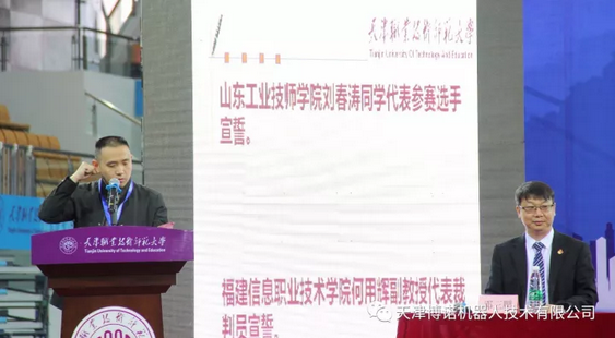 博诺开幕式由天津职业技术师范大学邓三鹏教授主持,天津职业技术师范大学李大勇书记致欢迎辞,天津市人力资源和社会保障局职业能力建设处于洋副处长以及天津博诺智创机器人技术有限公司周旺发总经理分别代表竞赛主管部门和承办企业致辞;最后裁判员和参赛代表宣誓。