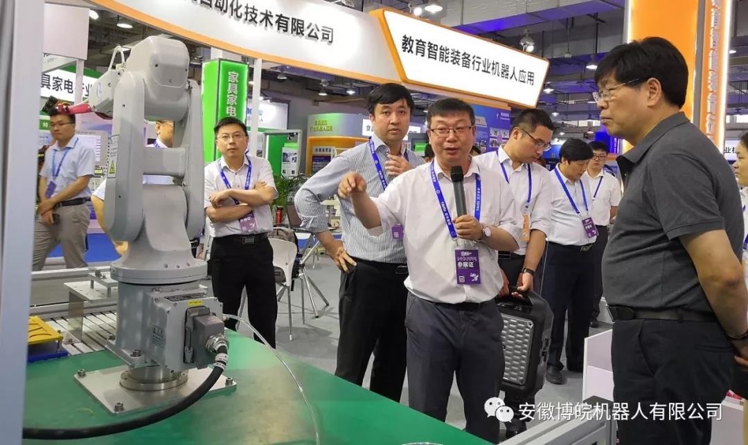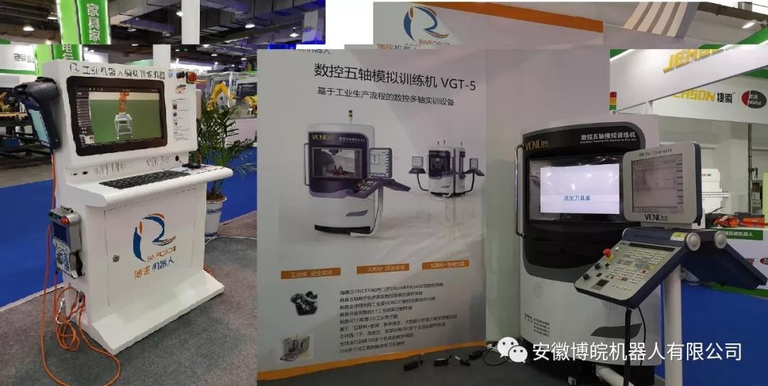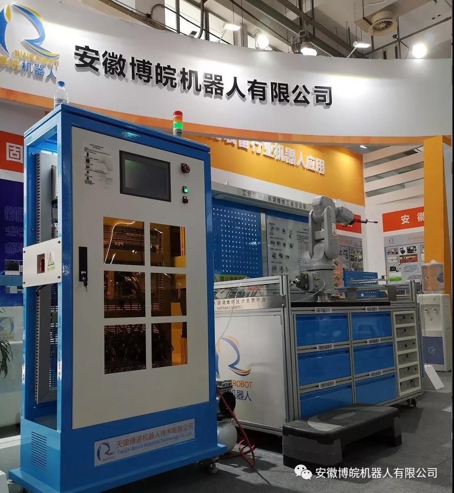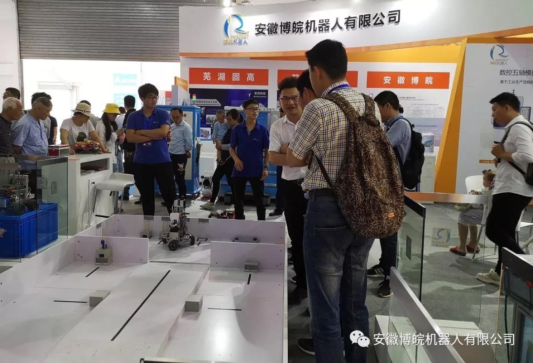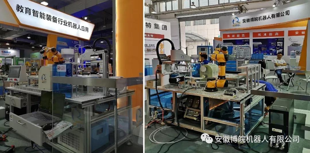 博诺科博会上,博皖机器人展厅150多平米,展出了工业机器人装调维修实训系统、工业机器人双机协作工作站、工业机器人模拟训练机、数控五轴模拟训练机、世界技能大赛移动机器人竞赛平台、智能变形仿生机器人等新产品,受到了观众的欢迎。