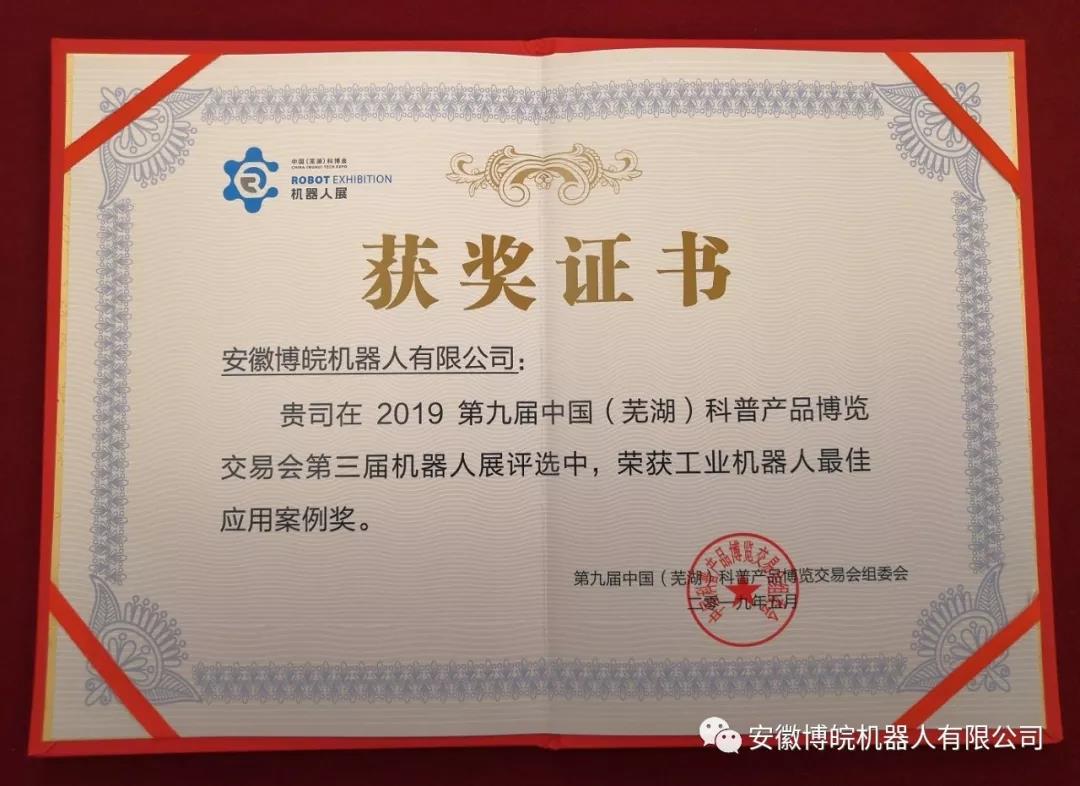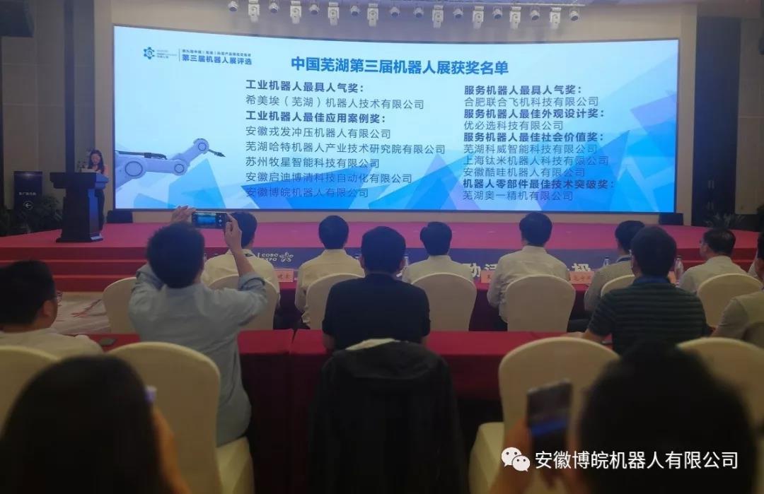 博诺经过大会的严格程序评选,安徽博皖机器人、安徽戎发冲压机器人、哈特机器人研究院、苏州牧星智能科技、安徽启迪博清科技荣获工业机器人最佳应用案例奖。