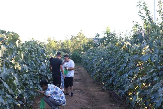 大家一下子钻进采摘园中,品尝甜美的水果,纳凉消夏,别有一番情趣。水果品种为巨峰、玫瑰香葡萄又有酥梨、苹果、桃子、山楂、核桃、板栗、甜枣、李子等。在阳光的照耀下,果实红的透亮,犹如一颗颗宝石,不一会儿的功夫大家便收获满满。