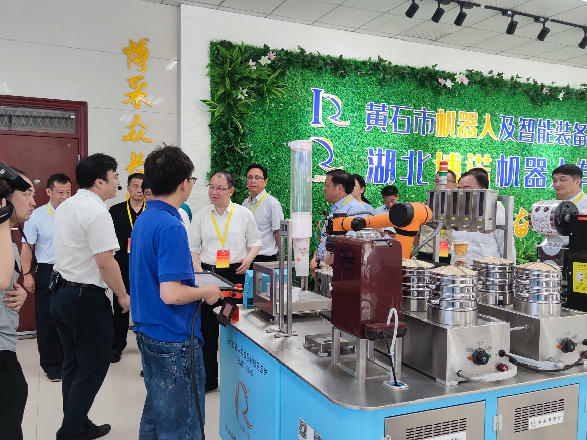 随后,向陈丰林书记一行汇报了BNRT-SRi5型协作机器人智能配餐服务系统,该平台为我司今年自主研发的新产品,为国际首创协作机器人在营养早餐的服务应用,拥有全部知识产权;接着向陈丰林书记示范了协作机器人的拖动示教和碰撞防护功能,这两项功能将大幅提升人机友好性,降低推广难度。