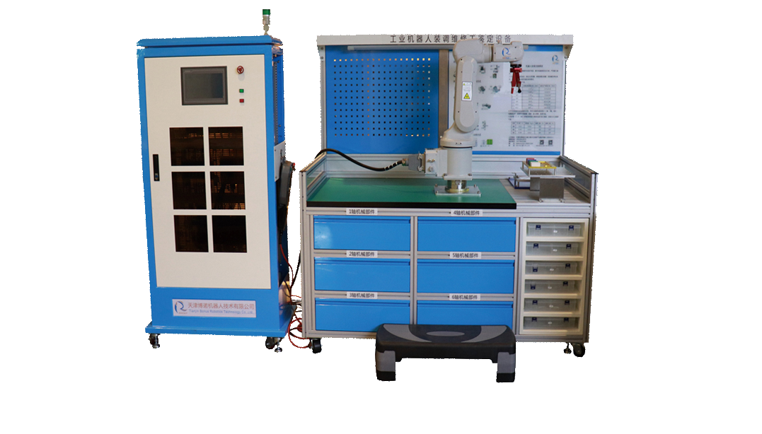 具备六轴工业机器人机械本体装调、电气控制系统装调,故障智能诊断与排除、整机装调、标定、维护与保养、编程、维修等功能,能够满足机械行业《工业机器人装调维修工》的实训考核任务,符合技能鉴定考核标准;平台采用关节式结构,按工业标准要求设计,结构简单、紧凑,适用于机器人装调与维修实训,可锻炼学生动手能力和精密装配能力,并且各单元模块可以拆装到螺钉级,使学生更深入了解工业现场常用机器人本体内部机械结构、机械连接、电机安装、减速器装配和同步带传动等内容。控制系统主要由伺服驱动、伺服电机、机器人控制器、IO接口板、示教器、PLC、触摸屏、工业机器人故障智能训练系统等组成。