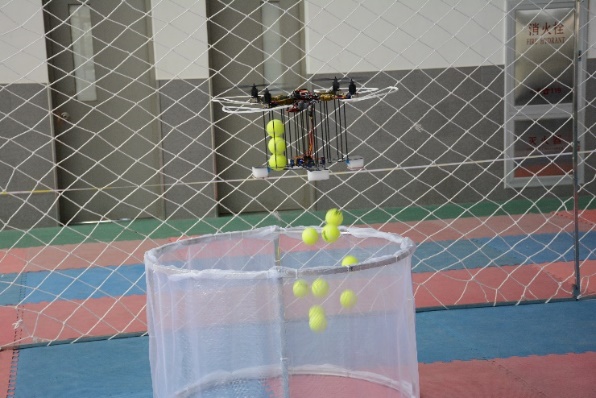 图4 空中机器人投放网球 图5 空中机器人穿越钢圈
