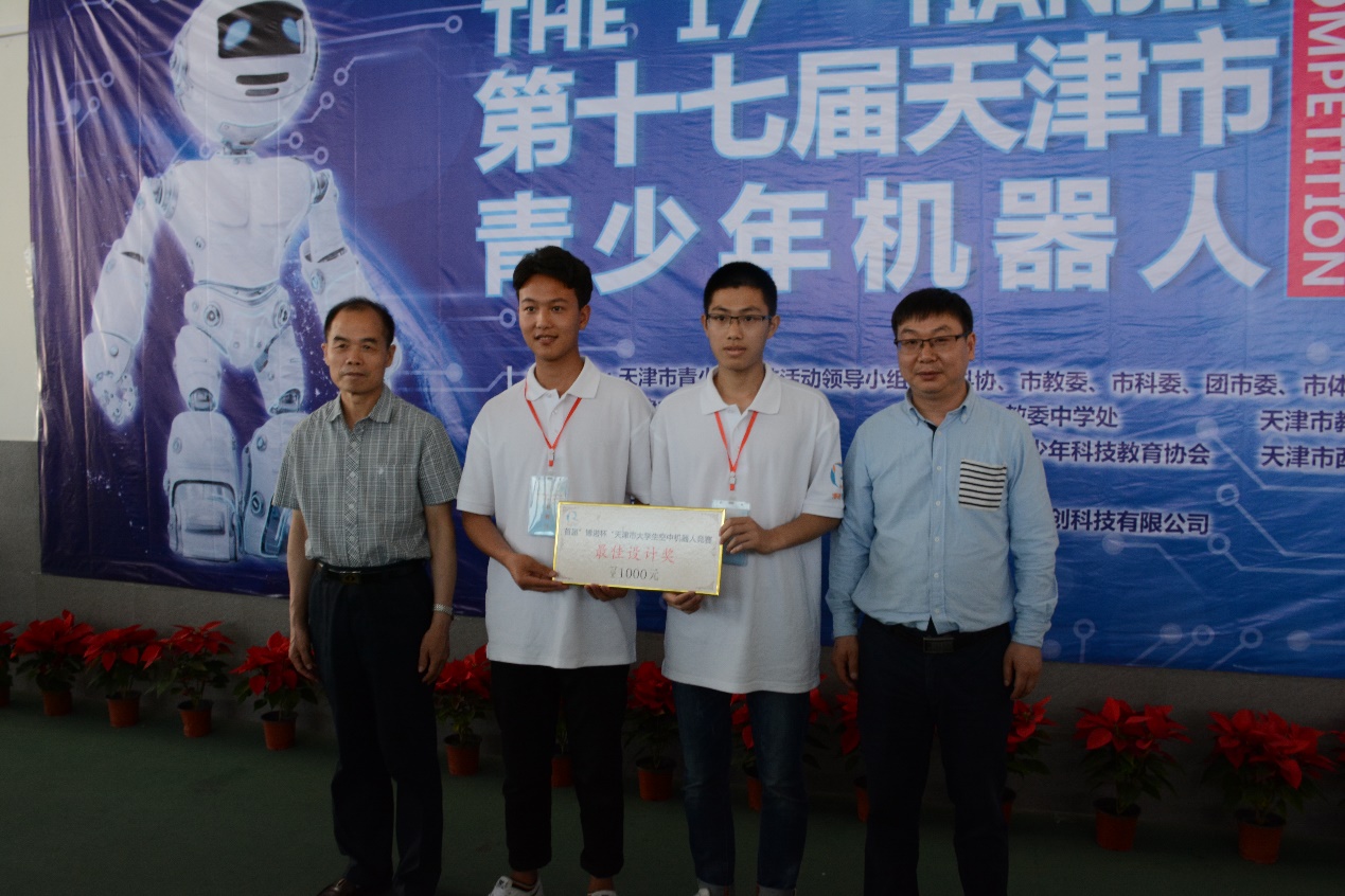 图9 天津职业技术师范大学苗德华副校长,邓三鹏教授与获得最佳设计奖的选手合影留念