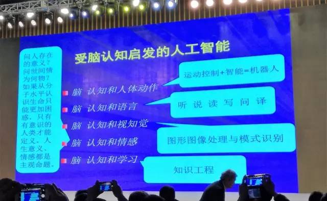 脑科学、脑认知成为全球的关注点,对应过来的是人工智能。去年我在这个会场上讲了智能车的产业化的思考,今年我讲一个学科的问题。受脑认知启发的人工智能,主要体现在脑认知和人体的动作,脑认知和语言,脑认知和视知觉,脑认知和学习。我周边的展览会讲的都是“运动控制+智能”。语言带来的智能的产业化给我们极大地惊喜,无论是听、说、读、写、问、译。尤其是问,这么多年来搜索引擎就是在问,一开始我们进入关键词,现在直接用语言来问。科大讯飞语音产业在全世界占到了应有的地位。