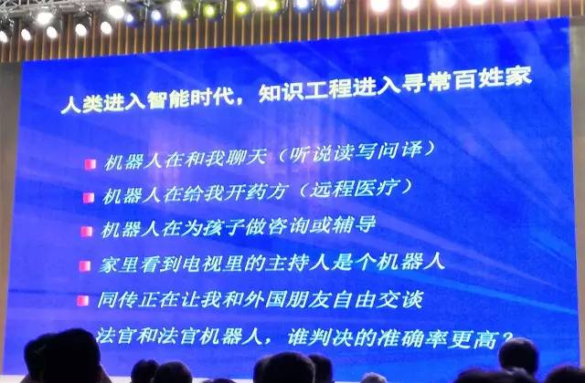 人类进入智能时代,知识工程进入寻常百姓家。你们看机器人在和你聊天,它在和你听、说、读、写、译,机器人在给你开药方,机器人在为你的孩子做咨询,做心理咨询,做辅导。我现在和东南大学合作,通过让孩子们在手机上玩游戏,我就可以预测他有没有自闭症或者说多动症,家里看到的电视里面的主持人可能是一个机器人,所以知识工程已经在我们的寻常百姓家里了。