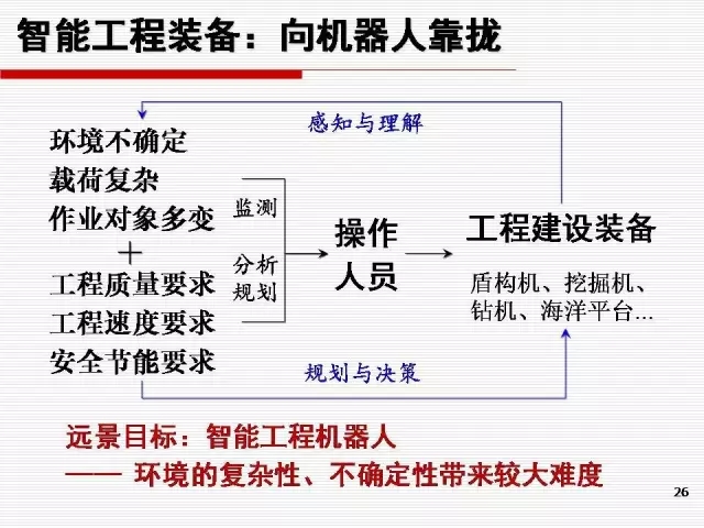 这方面我们已经在进行一些探索。当然也需要得到社会各界金融界的支持,需要国家重点研发计划的支撑。这块会带来很大的可能,我就不一一展开讲了。这方面需要做的事有很多,主要是在人工智能2.0下的智能装备在大型复杂装备上的应用,要做软硬件平台,硬件社会也要适应,然后解决现场施工的问题,从装备研制到施工的服务。