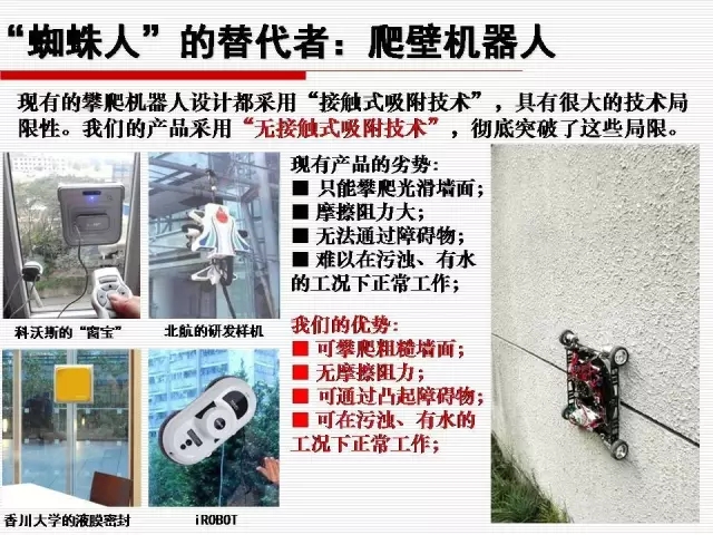 爬壁机器人早就有了,北航也做了。我们这里一个年轻副教授做的,做法跟以往不一样,实际上用了一个人工可控的龙卷风,吸力非常大。现在的负重做了三代,可以五公斤以上,做清洁没有问题。这块正在找产业资本,现在风投很多,但风投的做法是金融资本,磨不起。