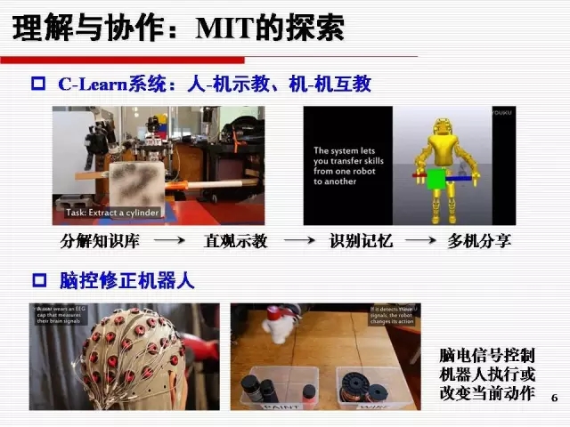 这是MIT最新的一些研究。它的研究跟以往不一样。就是可以把知识分解应用到教学里面。未来的教学不是单一的进行,而是一个可以帮助识别和记忆的机器人群的多机分享。还有一个脑控装备,它可以做多种动作,脑控在下一步将是无线。