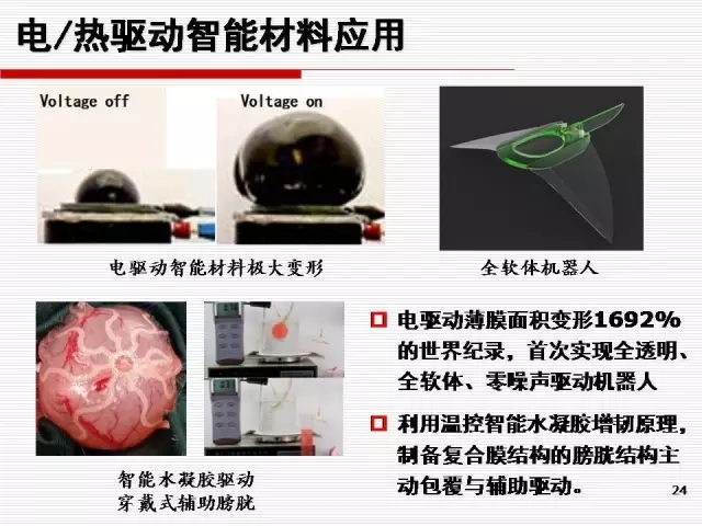 在电驱和热驱方面浙大做了特别的研究,有一个团队做全软的,通用软体材料,这个薄膜的变形可以达到1692%,创新的世界纪录,而且全透明、全软体、零噪声的驱动,由很高的电压、非常弱的电流实现,而且可以放在水里,也可以实现成群控制。有一项运用,我们可以看到,在医疗,用水凝胶赠韧的原理来做人工的膀胱,那么它可以收缩很大的面积,这为治疗特定的疾病带来新的可能性。