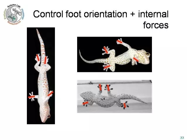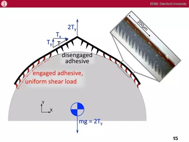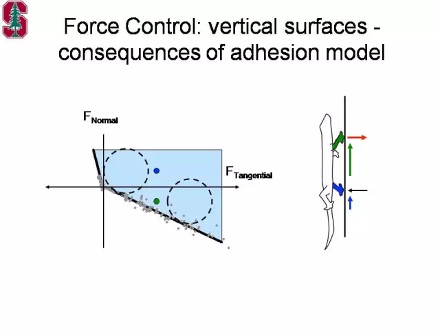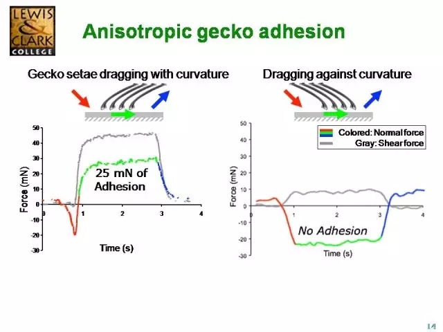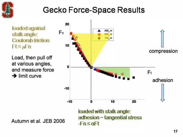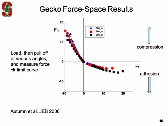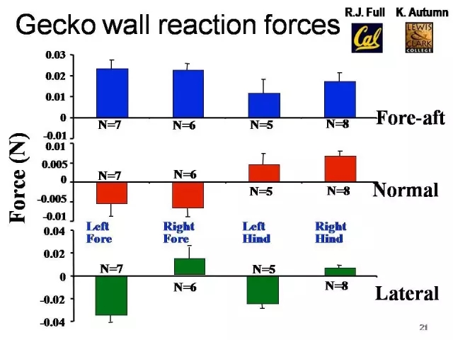 我们优化的策略就是应该在这个上肢更用力一些,因为更用力的话有更大的粘附力。可能对人来讲我们做不到这点,因为我们前臂没有我们腿来得有力。最起码可以让我们有检验的假设。什么假设呢?壁虎就是它是否可以会在前肢有更大的作用力呢?根据理论来讲这是比较好的想法,这样会生成更大的凝聚力或者粘附力。