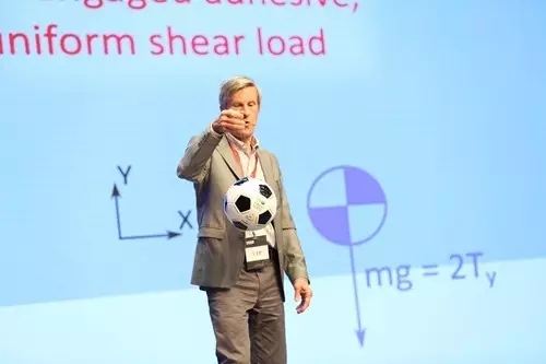 这页PPT,给大家展示一个例子更好一些。我没有带机器人来,但是有一些材料,这是我们有壁虎的材料,看上去不粘。如果把它进行载荷,如果有一个剪切力施加表面的话,它就可以很轻松抓起一个足球。它不是一个胶带,如果不加载剪切力一点都不粘。
