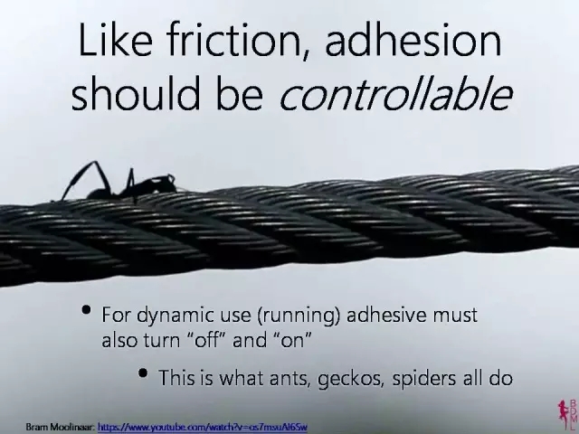 这里有一个小的视频,我播放一下,看看蚂蚁怎么在线缆上爬行的,它们每一次在提起脚的时候都有脚脱离,然后再放上去,它们可以非常快速的方式以很快的一个可控的粘附力在电缆上走。如果你很小的话,你可能很好地应用这个吸附力,如果你无法关闭这个吸附力,你将会粘在电缆上。我们人的吸附力比较好,可以快速地开和关,控制这样的吸附力。