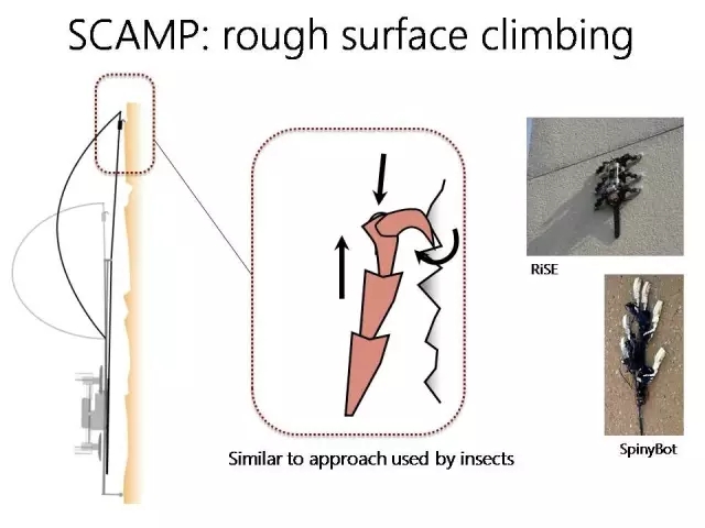 第三点,非常有意思。这一点,我在开始的时候并没有意识到。我们其实可以把爬行和四旋翼组合在一起,我们其实可以更加勇敢一点,爬上这个墙,如果哪怕失败的话也不是什么大事,我们可以再次爬,这是生理学非常好的灵感,有一些鸟用翅膀帮助它们爬行,特别是在悬崖或者树上它们用翅膀攀爬。还有昆虫,有非常小的一个刺,这个小刺能够卡在粗糙的地方,这个非常小。