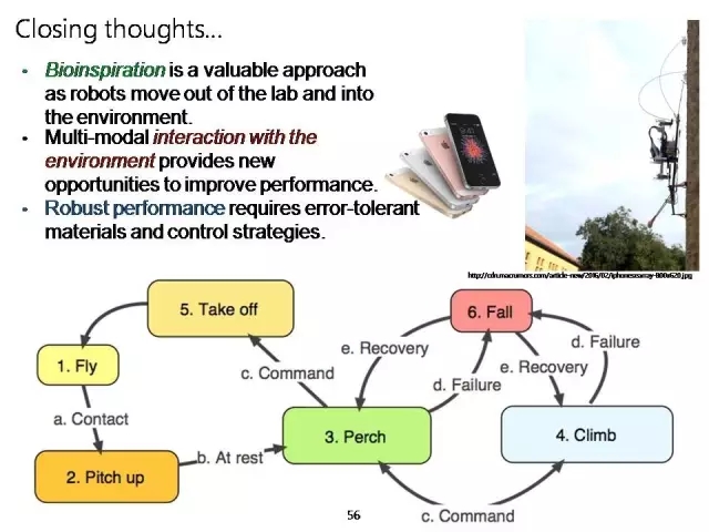 还有一个例子给大家看一下,我们待会儿可以做一个总结。这是四旋翼的飞机和无人机的例子。很多无人机的应用,比如说拍摄照片,或者是进行监控或者是绘图,飞来飞去都不会碰上物体,我觉得它们应当碰到物体,然后停下来再次起飞,这样确确实实能够节约大量的能量,把螺旋桨停下来可以节约很多的能量,这是自然当中的一个启迪。它在飞,然后停下来,吸在墙上。然后再次起飞,这样可以大节约能量。