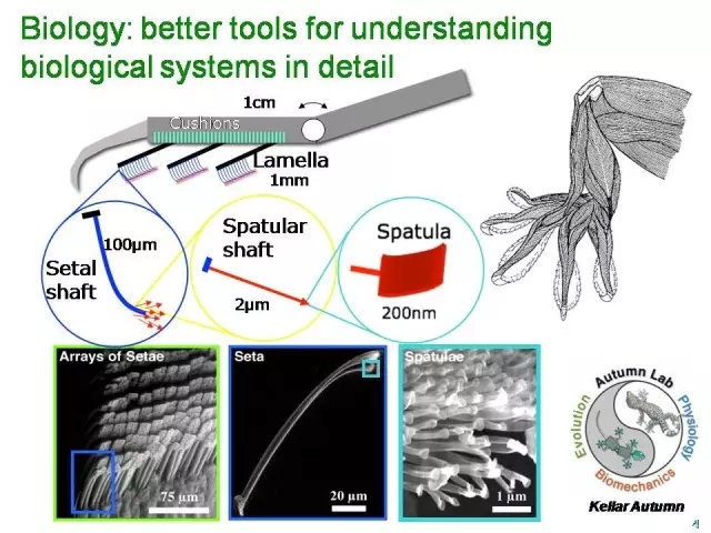 最后,它们并不是在环境当中生存,而是和环境进行互动的。非常有意思,还有KLOD,他也是另外一个合作教授,他研究壁虎为什么能够在墙上爬来爬去。这是一个非常复杂的体系,这里有一些特性,比如有厘米级、毫米级的,还有像微米级的,有非常小、仅仅几纳米的结构。