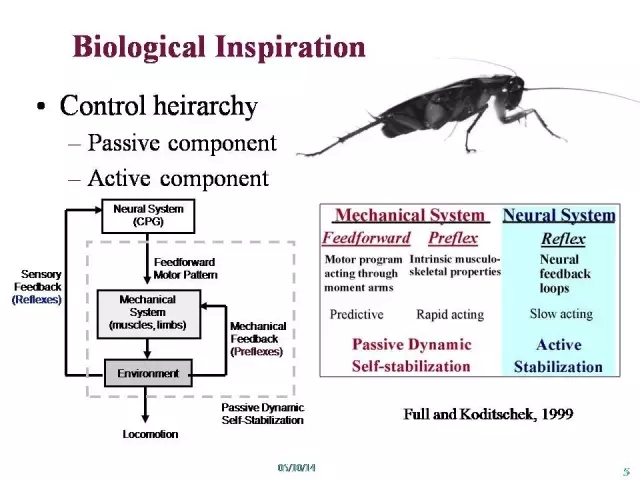 关于昆虫,你把它腿拔下来,它也可以工作。这个是机器人的腿,一个塑料。粉红色的是比较软的有弹性的塑料,看上去并不是像蟑螂的腿那样,但是我们确实让它有相同的动态的功能。比如说有的地方的刚度,或者它的能量的释放系数,使得我们机器人在跑或者越过障碍的时候像蟑螂一样。可以看到这是我们的一些机械智能,还有我们控制的智能。