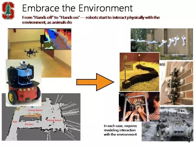 我们现在达到什么地步呢?我们知道有不同的机器人。一开始这种机器人,能够飞来飞去,拍照片,或者是有轮子在下面,在地上爬来爬去,或者有超声传感器建立地图。它们其实不是互动性的,和环境没有互动,因为互动是有风险的。我们开始碰上环境的话,一定会遇上问题,可能有磨损或者是坏掉。他们叫做这个非触碰机器人。