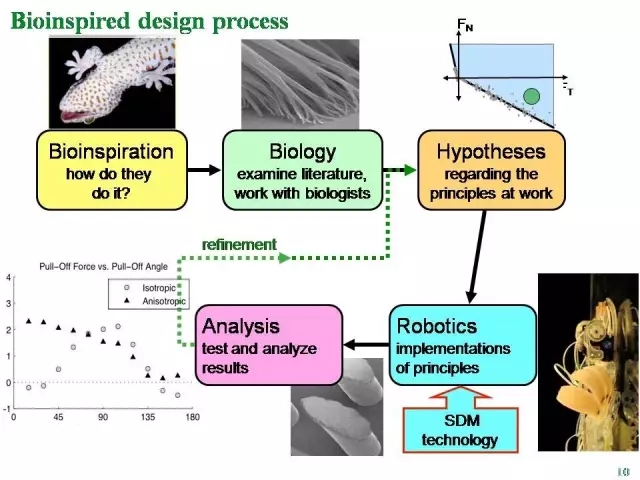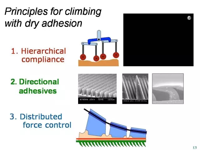 这是我刚才所说的非常重要的一点,就是让我们考虑一下,对于它们来讲最重要的原则是什么,从壁虎角度来讲非常典型的一点,我们可以观察到,通过不同的沟通之后,我们会觉得需要能够根据不同的尺度的表面进行一个契合,有一个层级的契合度,因为它可能是很精彩的力。然后它可能在这个表面,有分子层面的契合度。
