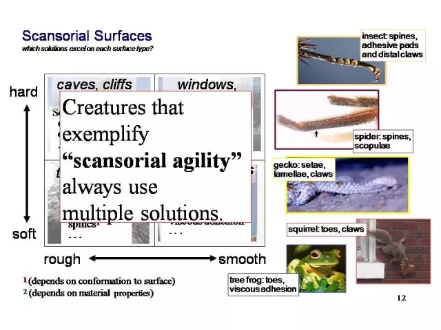 另外要考虑的,就是观察动物的时候,非常有趣的一点,在不同类别的动物当中有同样的原则。你想像一下爬山的动作,有不同的表面,你希望能够在上面进行攀爬,有的时候比较硬或者比较软。不管这些壁虎,还是松鼠,在右下角大家看到有一个松鼠,从某个人的厨房里面爬出来的,嘴里面还有食物,它在向下攀爬。对动物来讲,不同的表面他们有不同的解决方案。