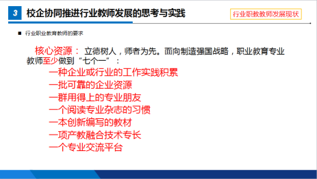 博诺机械工业教育发展中心产教合作处处长王志强分享了题为“校企协同发展下机械行业职业教育教师发展的思考与实践”报告,面对产教发展的新形势,对技术技能人才培养提出了新的要求,提出“根本靠教育,关键在教师”,并指出面向制造强国战略,职业教育专业教师应具备的“七个一”能力,引起了研修教师的共鸣。