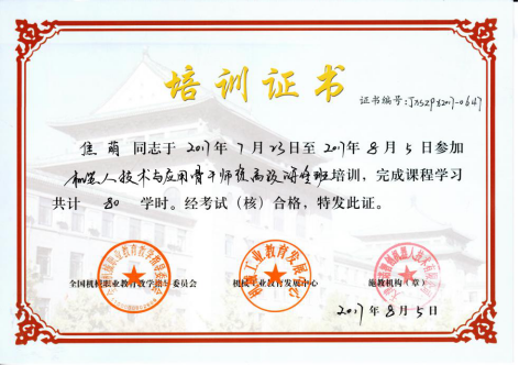 第三期全国“博诺”机器人技术与应用骨干师资高级研修班圆满落幕,各位骨干教师收获满满,并取得了由全国机械职业教育教学指导委员会、机械工业教育发展中心和天津博诺智创机器人技术有限公司颁发的证书。