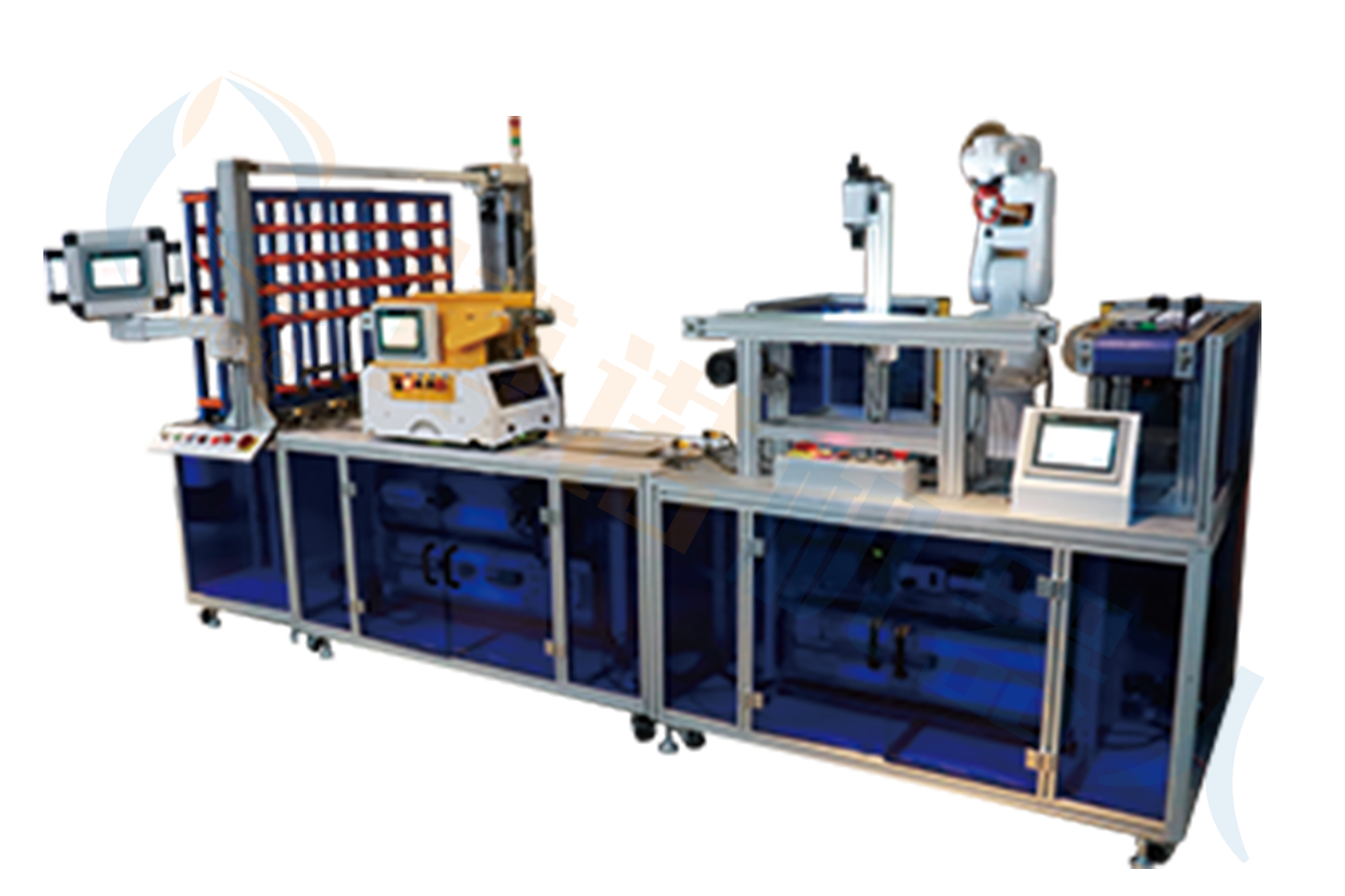 3.包含直角坐标机器人、AGV机器人、六自由度串联工业机器人三种工业机器人,协同工作,完成仓储、运输、检测、分拣、装配等综合任务。