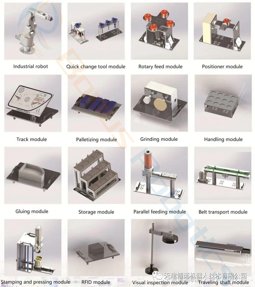 Each module is designed and manufactured in accordance with industrial-grade standards. Electrical and pneumatic components are selected from influential brands in the industrial market. Among them, PLC, human-computer interaction interface, servo system, inverter, and RFID are all selected by the Siemens brand. Industrial robots and PLC, human-machine interaction interface, servo, inverter, industrial camera, RFID, etc. all carry data exchange via Industrial Ethernet or Fieldbus.