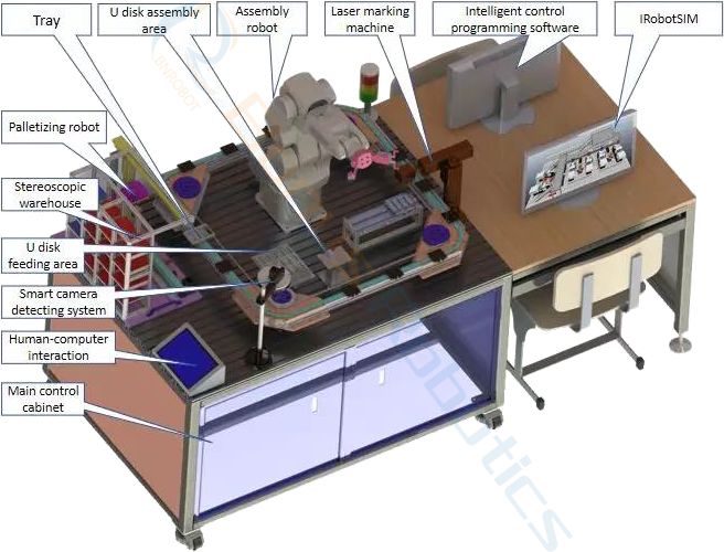 博诺The intelligent control and simulation training system consists of the assembling industrial robot, the stacking robot, the three-dimensional warehouse, the intelligent camera, the pallet, the PLC control system, USB flash disk assembly center, the feeding area, the laser marking device, the ring assembly line, the sensor, smart IRobotSIM manufacturing production line simulation software and programming the computer, etc., the main functions are as follows:
