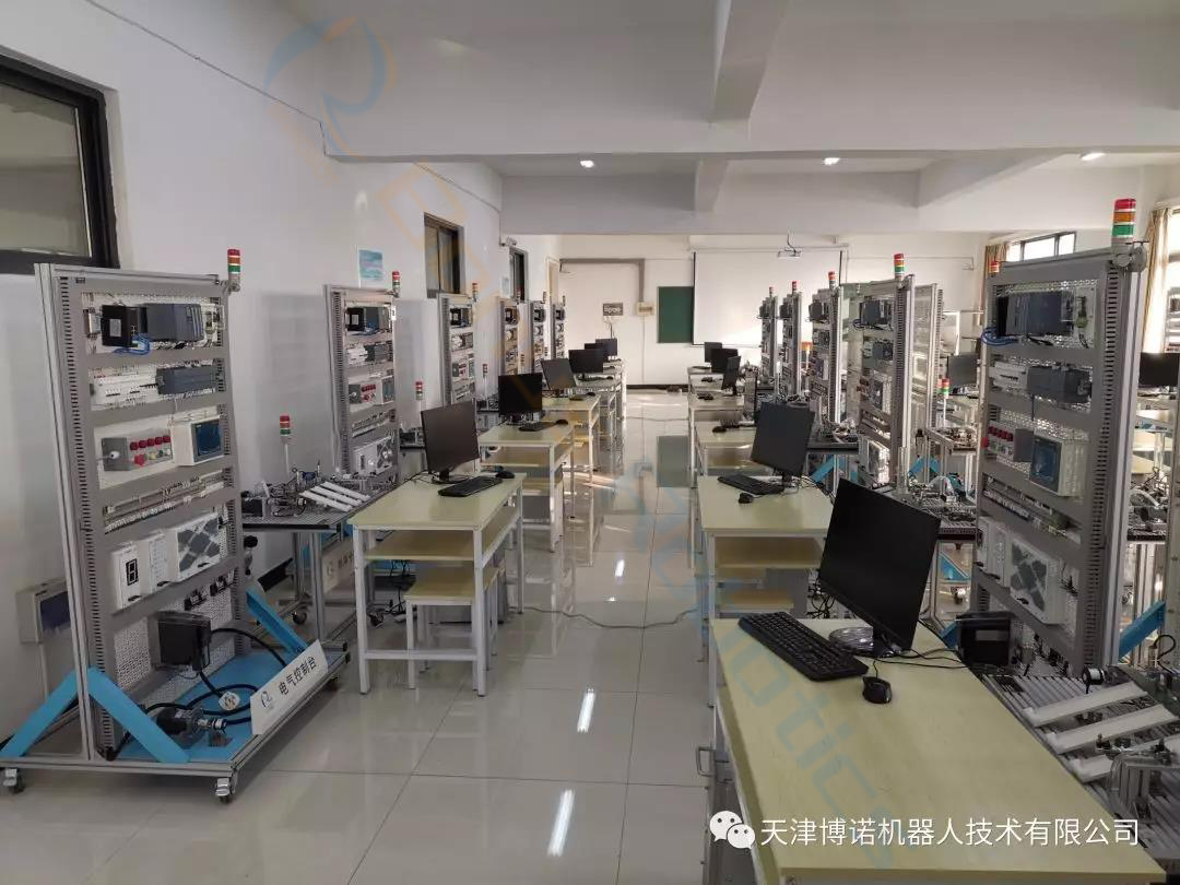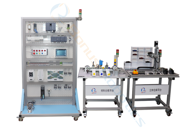 The PLC intelligent control training system consists of Siemens 1200/1500 series PLC, digital expansion module, analog expansion module, industrial touch screen, servo drive unit, variable frequency drive unit, industrial Ethernet switch, indicator, and a button unit, temperature control module, motor forward and reverse simulation module, traffic light simulation training module, seven-segment display module, water tower, water level, and multiple liquid mixing simulation module, sky tower optical light simulation module, vending machine simulation module, automatic feeding and loading system simulation module, rod slider module, a three-dimensional warehouse application platform, a material sorting application platform, and industrial ethernet communication. The components can be installed on standard mesh control screens and aluminum alloy installation platforms according to the task needed, using field buses and computer networks. And industrial configuration software technology, to establish experimental software and hardware platforms with multi-layer networks; to meet the professional training, and evaluation of intelligent control technology, electrical automation, mechatronics, industrial robots, mechanical automation, and other specialties.