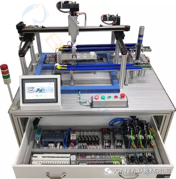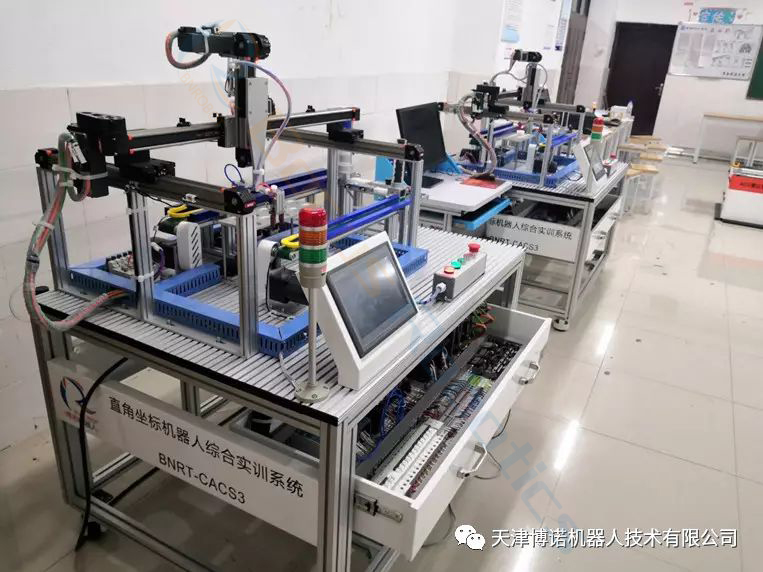 Trussed robots are also known as Cartesian robots and gantry robots. The BNRT-CACS3 truss robot training system consists of a PLC controller, an assembly conveyor, a rectangular coordinate robot handling device, a linear conveyor, a well-type feeding system, and a storage system, console, computer,etc.