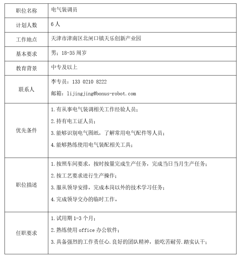 招聘电气装调员