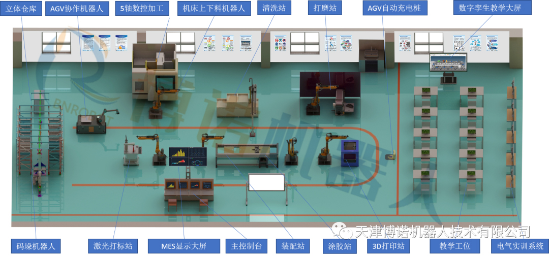 系统由48库位自动化双排立体仓库、协作机器人移动搬运系统、数控五轴、工业机器人激光焊接系统、工业机器人打磨/抛光系统、3D打印系统、工业机器人涂胶系统、视觉检测系统、RFID识别系统、工业机器人装配系统、工业机器人激光雕刻系统、MES管理系统、WMS管理系统及数字孪生系统等组成。配备数字孪生控制系统,根据作业任务和现场环境变化远程调试,将整个系统快速进行重组和调配,以适应多品种、小批量的生产作业;在教学应用中,可以掌握智能装备的应用和综合集成技术,开放各系统源程序。