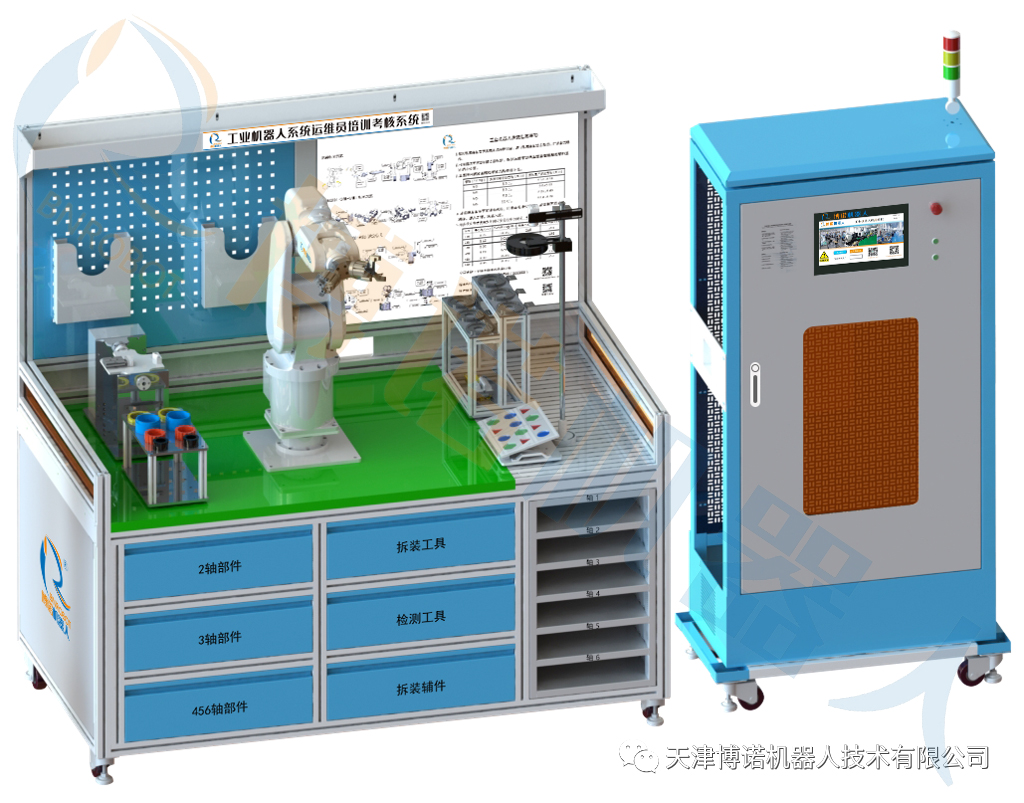 工业机器人系统运维培训考核系统是依据人社部颁布的国家新职业标准《工业机器人系统运维员》开发的培训考核设备,由可拆装六轴工业机器人、工业机器人运动控制器、伺服驱动器、工业机器人故障设定及诊断智能训练系统、可编程控制器、触摸屏、智能相机、在线监控系统、操作台、编程工作站和供气系统等组成。满足机械系统检查与诊断、电气系统检查与诊断、运行维护与保养、数据采集与状态监控、故障处理等职业功能的培训和考核要求。工业机器人本体可选配KUKA、博诺、ABB、FAUNC、埃夫特、安川等系列。